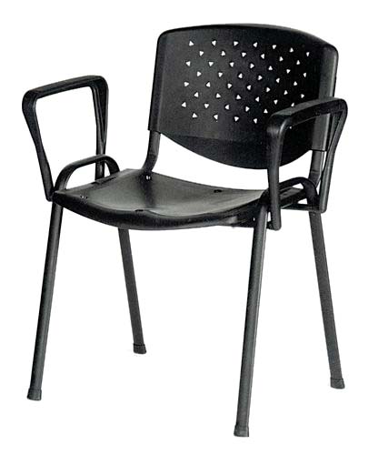 Tárgyaló szék, műanyag háttámlával, kárpitozott ülo rátéttel, acél lábazattal és csúszásgátló talpakkal.